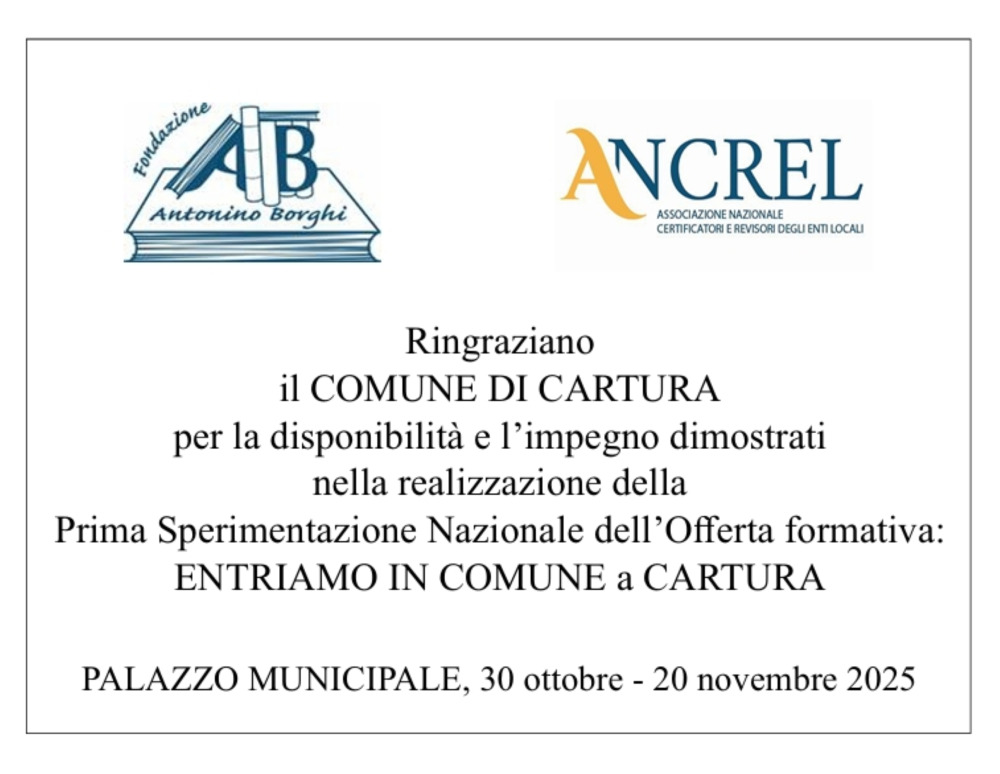 Giovedì 20 novembre presso il Comune di Cartura (Pd) il Sindaco Sig.ra Serenella Negrisolo ha accolto per la seconda volta i revisori che hanno partecipato alla prima sperimentazione nazionale, suggerita dall'ANCREL alla Fondazione Antonino Borghi , "ENTRIAMO in COMUNE".